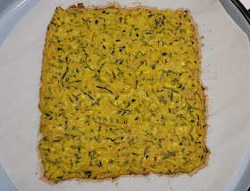 Tikvice narendati na krupno, posoliti i staviti u cetku da se ocedi. Dobro je ostaviti bar 1/2h. Kada je odstojalo, stiskati rukama da se sva voda ukloni. Staviti u činiju sa jajetom i brašnom, sve fino sjediniti. U podlogu možete dodati začine koje volite. Meni je bilo dovoljno samo so, jer volim posle da se fino oseti origano. Na tepsiju staviti papir, izručiti smesu i oblikovati podlogu. Ja sam ovog puta napravila da bude kvadrat, ali možete i krug. Dovoljna je debljina nekih 8mm. Rernu zagrejati na 220C, kada ubacite tepsiju, smanjite na 200C i pratite dok se peče, treba da dobije finu zlatnu boju kao što vidite na slici.